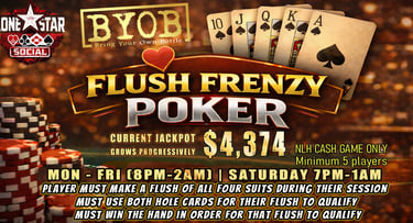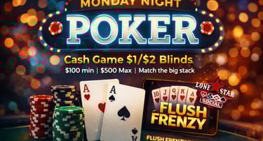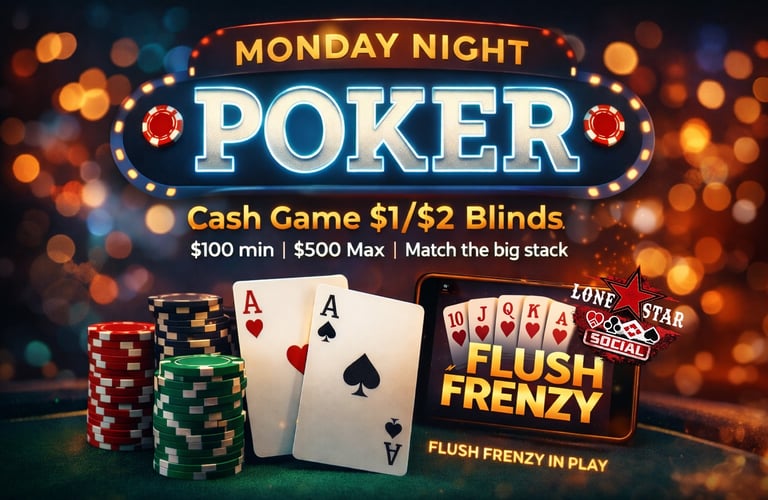 Are you ready to test your skills, bluff your way to victory, and win BIG? Look no further! Lone Star Social invites you to join us for an unforgettable gaming experience. Whether you're a seasoned pro or a beginner, there's a seat at the table just for you. Cash games and Poker Tournaments.